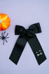 Hand embroidered black cat on right tail on the bow.
