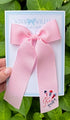 We have hand-embroidered this long-tail bow with a July 4th design. This grosgrain bow comes in two sizes. The medium bow uses ribbon that is 1.5 inches wide and the large ribbon is 2.5 inches wide.