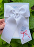 We have hand-embroidered this long-tail bow with a bow and July 4th sparklers. This grosgrain bow comes in one size. The large ribbon is 2.5 inches wide.