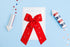 We have hand-embroidered this long-tail bow with red, white and blue stars all over! This grosgrain bow comes in three sizes. The small bow uses grosgrain ribbon that is 7/8 wide. The medium bow uses ribbon that is 1.5 inches wide and the large ribbon is 2.5 inches wide.